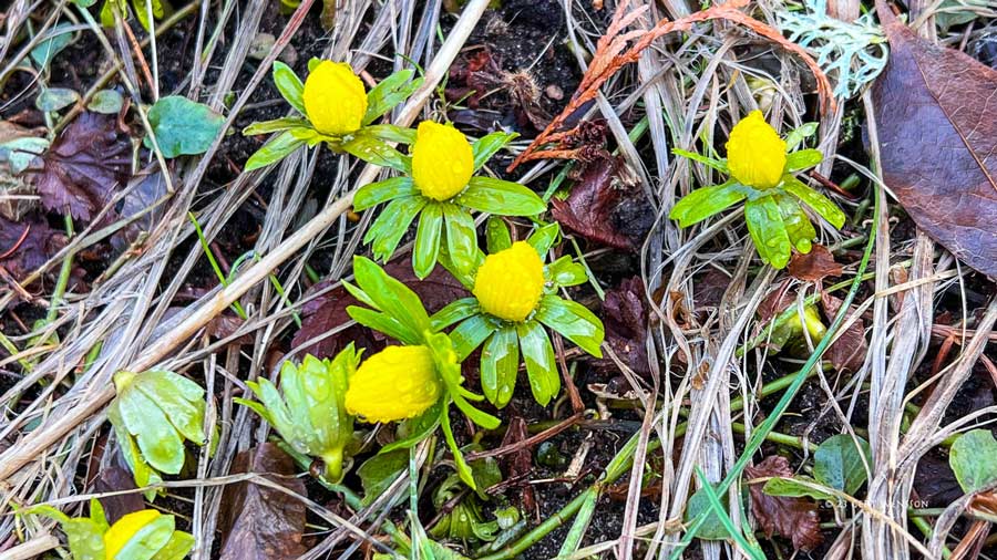 Roten är en liten svartbrun knöl. Vintergäcken blommar mars – april. Plantan blir 8–16 cm hög. Blommans bräm blir 3–4 cm i diameter och består av sex gula hylleblad (ombildade foderblad) placerade ovanför en krans av gröna stödblad. Innanför de gula hyllebladen finns sex små rörlika kronblad samt 30–40 ståndare.