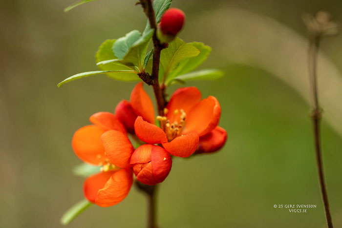 Blommorna kommer flera tillsammans längs grenarna. Foderbladen är fem, hårlösa, hela, upprätta, de faller efter blomningen. Kronbladen är fem. Ståndarna är många till antalet. Fruktämne med 5 karpeller och fem fria pistiller. Frukterna är skaftlösa och svåra att lossa från frukveden. Fruktskalet är ljusgult till ljusbrunt och frukterna sitter kvar till långt in på senhösten eller vintern.