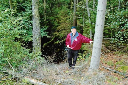 Det är det enda synliga idag. Vid den tiden fanns det inte något folk ute – Aktuellt, Rapport på TV, i den lilla byn. Alla satt inne– helt tomt på folk. Men vid ett hus, vid bussparkeringen, gick en kille med en Trimmer 2-takt. Hjälm och öronskydd. Jag såg från bilen att han hade stora örhängen nedanför öronskydden. Jag tittade på honom och tänkte – en sådan med örhängen vet väl inget om kriget. Men där fanns ingen annan, så jag gick bort till honom. Han stannade motorn och tog bort ett öronskydd. -”Hello I´m from Sweden, near my home has one Lancaster cracht, and I look after the airfield? Han slet av sig hjälmen och sa “-yes follow me”. Så sprang han med –stora ”älgakliv” bakåt vägen, så jag gjorde en högersväng med SAAB:en och såg precis hur han sprang upp vid en hög häck till vänster.