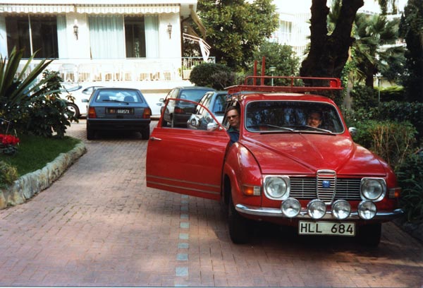 Trodde vi. I sista svängen före mål, får jag rätt not av Jan; 5:a höger+ 5:a vänster, vilket betyder, skarp höger, näst intill hårnål. Kraftig nedförsbacke gör att bromsarna är rödglödgade, spilld olja finns på vägen, farten för hög -besättningen trött, däcken helkass m.m. Resultat; I nästan 100 km/tim tappar de usla Good Year däcken fästet på oljedränkt asfalt och ostyrbar bär det rakt på ett stort träd. Smällen blir enorm, det tog mellan grillen och höger strålkastare. Bilen girade om till höger och backade nerför stupet. Ett tiotal meter ner står ett träd som stoppar upp DD Gripen och trycker in bakluckan. Hade inte det trädet stått där, hade vi kanske inte landat vid medelhavet ännu.