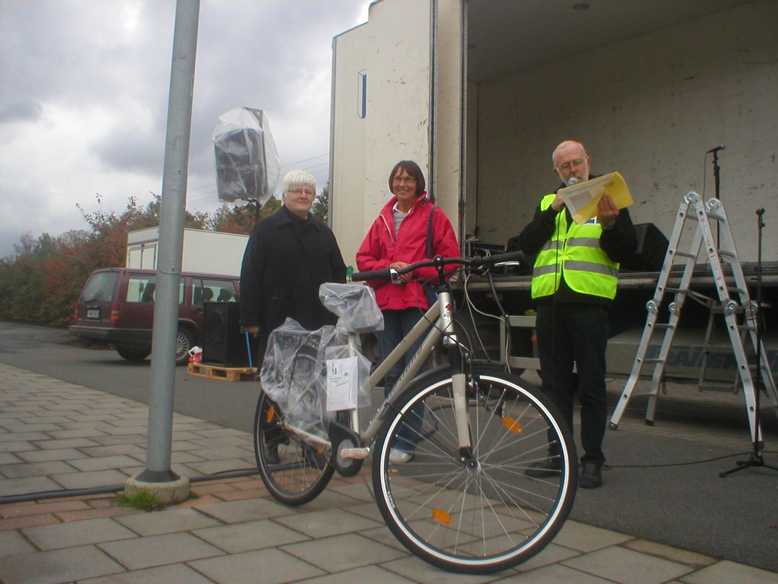 Elsa tog tacksamt emot en cykel vid scenen och fick hjälp att vrida styret rätt innan hon ledde cykeln hem för montering av tramporna.