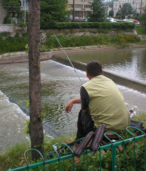 | En ensam fiskare mitt i Sarajevo. Med spöet i handen och kryckorna bakom sig, försöker han få napp. Det finns många krigsinvalider i Bosnien. | ![]() |