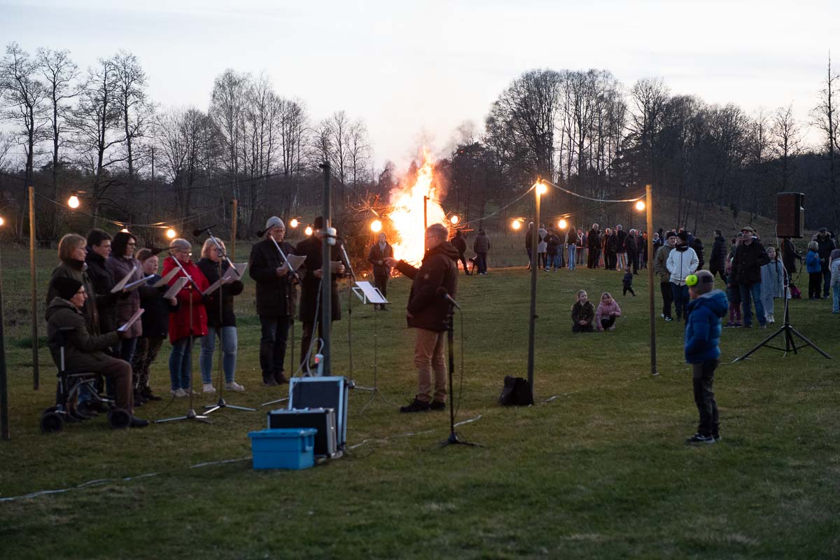 Ett långt fackeltåg startade i skymningen vid Bygdegården för att ringla sig ner mot ängen vid Vieån nedanför kyrkan. Med sina facklor tände man det stora bålet som snabbt lyste upp kvällshimlen.