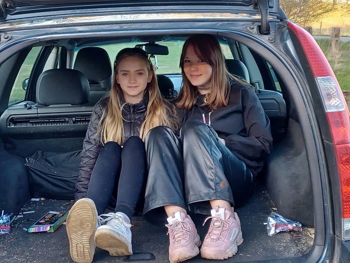 Vinden var bitvis kall och då gäller det att hitta en bra plats att läa på, som dessa båda flickor som helt enkelt satte sig i bagageutrymmet i bilen.