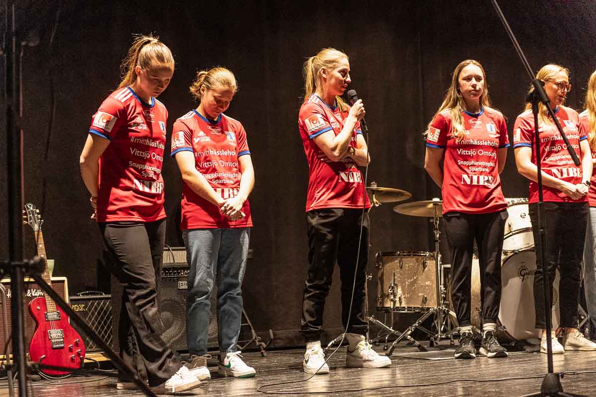 Därefter följde en mycket kort presentation av lagets flesta spelare. Tyvärr missade konferencier Håcan några av spelarna. Det var imponerande att höra om deras fotbollsmeriter, även antal matcher i landslag för respektive land. Samtidigt som de bedriver en fotbollskarriär har spelarna klokt skapat en civil utbildning att falla tillbaka på. I årets Vittsjö-lag finns många olika yrken representerade.