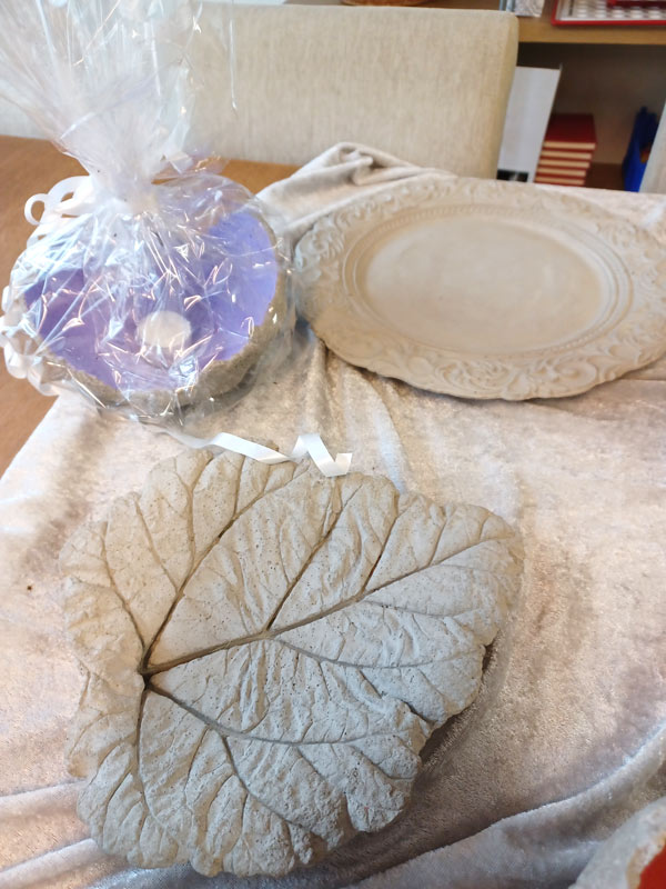 Dom har lärt sig att göra egna latexformar, att olika betongblandningar ger olika lyster på föremålen. Om man använder golvspackel ger detta en len och mjuk yta medan finbetong ger en strävare yta.