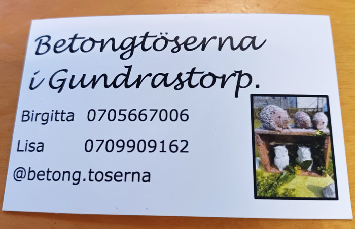 Birgitta berättade hur det hela började en sommar för ca 25 år sedan då hon tillsammans med sin svägerska började göra saker och ting i betong. De båda hade då tröttnat på att ”bara ligga och sola” och ville göra något annat. Birgitta har hållit sitt intresse vid liv under årens lopp men efter det att Lisa gick en 4 timmars kurs i Tyringe så började dessa två så smått att avancera med sin betongkonst.