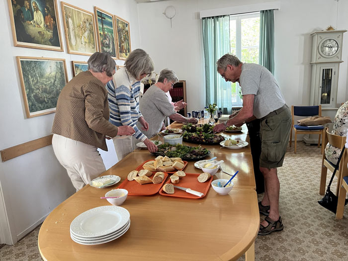 Stora fat med kyckling, kött, grönsaker och frukt dukades upp på ett långbord tillsammans med bröd, smör och ost. Så småningom kom även underhållningen igång med den mångsidige musikern Krister Wrambjer.