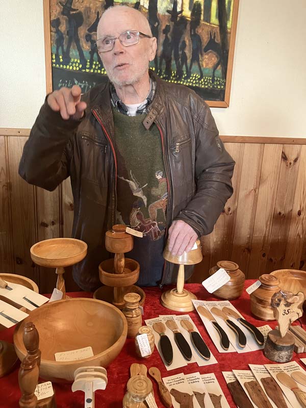 Nisse Björk Träarbete, med bl.a den 85-årige veteranen Nisse Björk. En trähantverkare med träskalle, enligt honom själv! Örhängen, tvålar, patchwork, stickat och sytt fanns också.