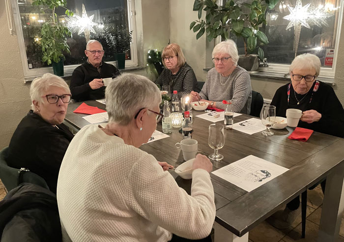 Efter glögg och pepparkaka fick vi avnjuta ett läckert julbord som innehöll allt som hör till ett julbord. Bröd, smör, ost, ägg, sill, lax, köttbullar, prinskorv, brunkål, revben, Jansson och omelett och mer därtill.