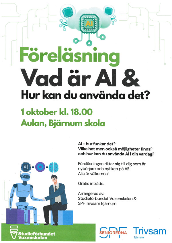 BJÄRNUM. Onsdagen den 1 oktober inbjuder SPF Trivsam i Bjärnum alla intresserade till en AI – föreläsning i Bjärnums skolas aula kl 18.00.