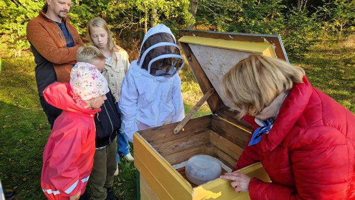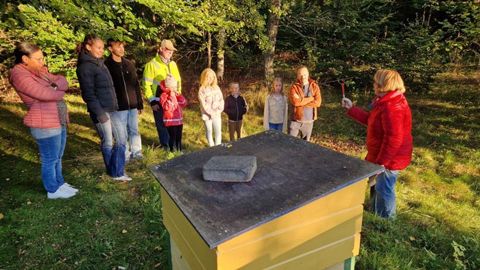 Först samlades tiotalet barn och ungdomar plus några vuxna runt bikuporna. Karin berättade bland annat att hon tagit bort honung från bina och att de har fått sockerlag i stället.