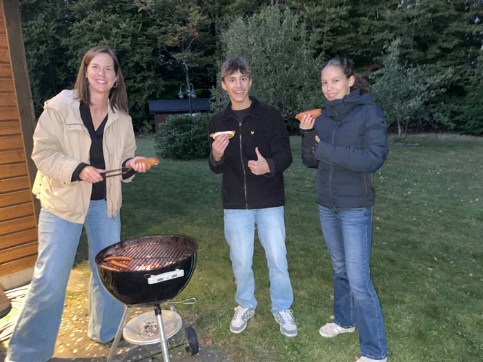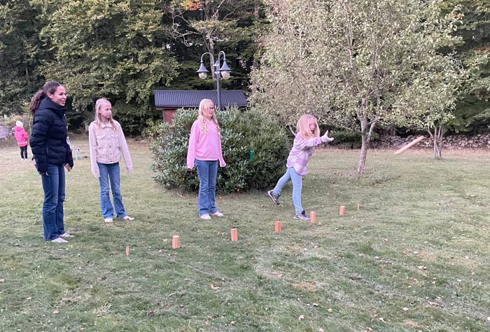 Efter detta var det dags för kubbspel. Maria Wilhemsson, en av de vuxna, höll i tävlingsreglerna för kvällen, och det blev spännande dueller mellan lagen. Det visade sig också att Maria var en mycket duktig grillmästare, så det dröjde inte länge förrän det var dags för korv med bröd samt saft.