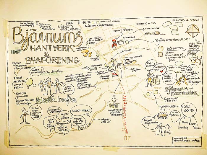 Vandringen avslutades i föreningens lokal under restaurang Tre Hammare med en fika och att de närvarande sedan tillsamman ritade en sorts karta över vad som känns viktigt för byn.