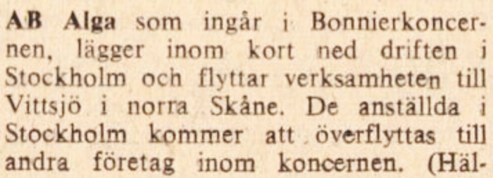 VERUM. I en artikel 2019-12-25 presenterade Aftonbladet boken om Alga skriven av Jimmy Wilhelmsson, Orvar Säfström och Ika Johannesson: Alga, grundat 1917, hade ursprungligen till uppgift att sälja tobak, pappersvaror och godis via Pressbyråkioskerna. När Bonniers sålt Pressbyrån 1940 fick Alga från Åhlén & Åkerlund ta över koncernens tillverkning och försäljning av sällskapsspel. Arrangemanget var praktiskt: Alga importerade spelen, Åhlén & Åkerlunds veckotidningar utnämnde dem till den nya flugan och Bonniers tog hem pengarna. … Bonniers sålde Alga till Brio 1982. Proventus köpte Brio 2004 och numera ägs hela klabbet av tyska Regensburger.