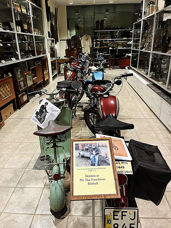 Två andra stora samlingar som skänkts till museet kommer från Per Åke Enochsson (1930 – 2021) från Röshult. Det är dels en mängd större och mindre motorcyklar, dels olika slags vapen. Motorcyklarna utvecklades i takt med att Sverige växte fram som en industrination och användes av många arbetare för att ta sig till och från jobbet på ett bra sätt. Bil var det få som hade råd med på den tiden. Den äldsta motorcykeln i samlingen är en Monark från 1938.