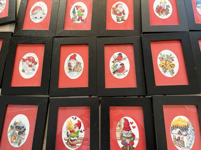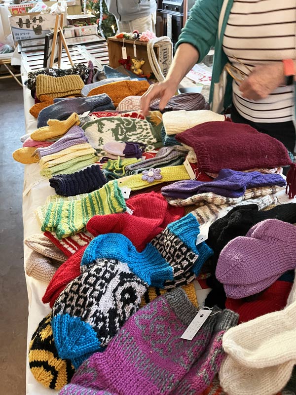 Sydda julmotiv Mycket finns naturligtvis att köpa som sig bör när man gick på julmarknader av alla de slag, stora som små. Det finns alltid något som tilltalar en lite mera: vackra julkransar, honung som är närproducerat. Många fina jul mönster och garner att handla in till alla de som syr eller stickar hemma. Medan vi strosar runt i lokalen så hörs julmusiken från scenen.