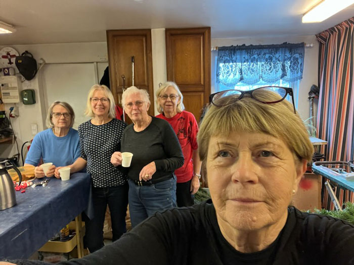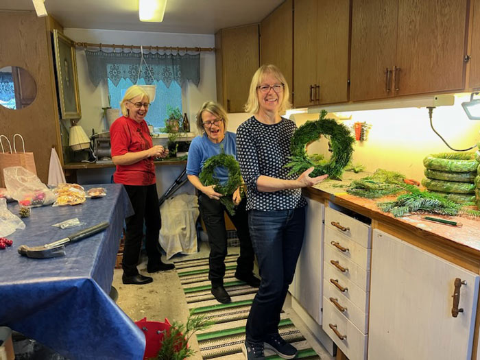Inga Petersson, Ulla Stridsberg, Kerstin Tillström och Agneta Dahl samlades hemma hos Karin Svensson i Farstorp för att gemensamt tillverka de speciella kransarna. Kvintetten jobbade hårt och under god stämning, timme efter timme. Glada vinnare tog med tacksamhet emot de lokalt producerade julsakerna.