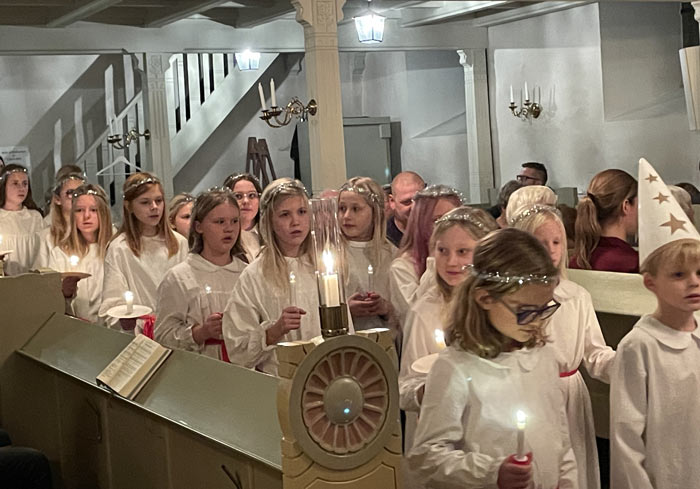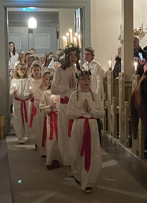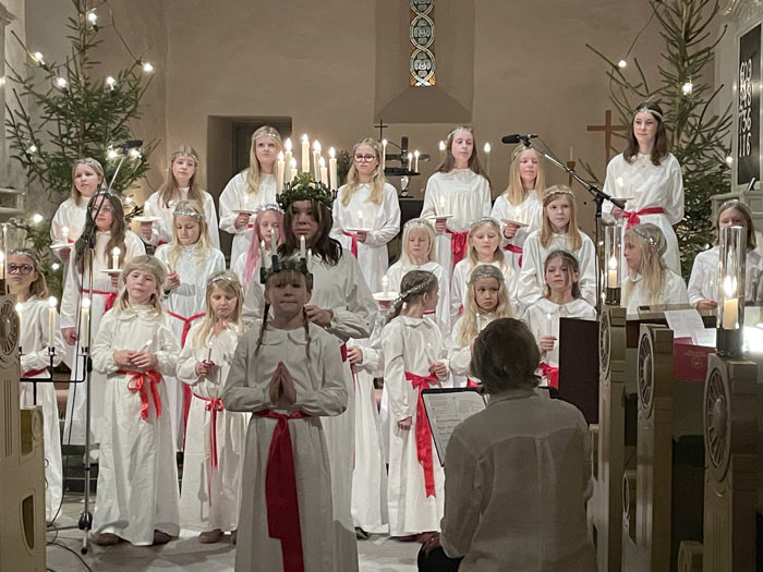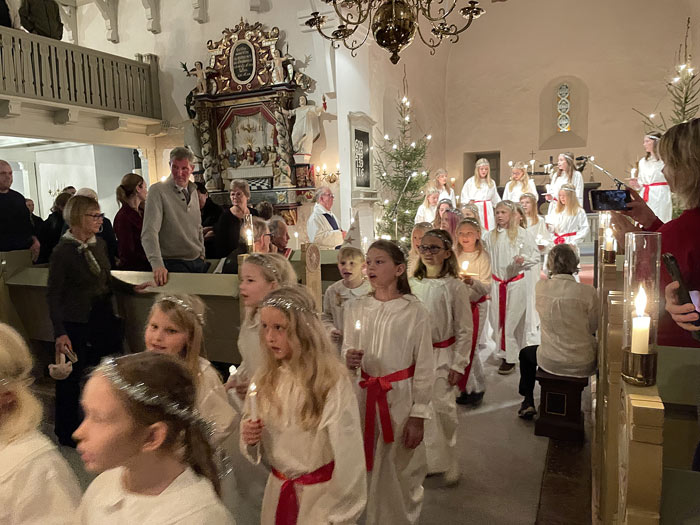 Tack till Verums bygdelag som hade tänt dessa. Kyrkan var nästan fullsatt när ungdomskörer från Vittsjö med två Lucior, Malva och Astrid, tjugo tärnor och en stjärngosse tågade in sjungandes Luciasången, under ledning av Marie Lind och Mats Lunnergård.