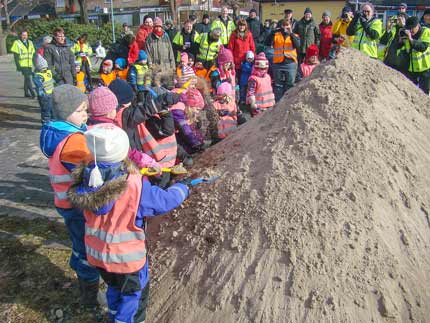 Barnen tar första spadtaget o välkomnar tågen till Bjärnum