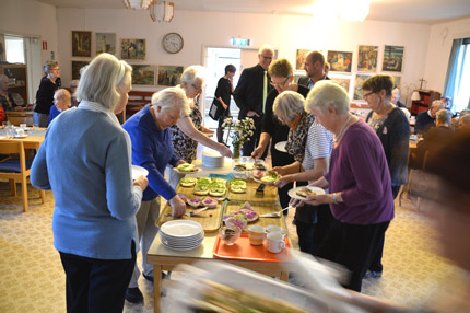 Samling hölls sen i församlingshemmet där CK bjöd på bredda smörgåsar samt kaka till dessert. Efter måltiden var det Hans-Erik Lunnergård som fattade tag i auktionsklubban. Utbudet av höstskörd bestod av äpplen, pumpor, morötter samt en hel del annat som tillhör det matnyttiga intaget. Intäkterna från denna försäljning tillfaller oavkortat organisationen Smile! Centerkvinnorna har under många år, minst från år 1983 haft ansvaret för detta samkväm efter gudstjänsten på Tacksägelsedagen.