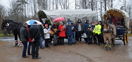 I väntan på bättre väder innan embarkering skedde var logen en naturlig samlingsplats. Visst kom det bybefolkning men i sånggruppen deltog även tillresande från Klippan och andra orter. Det blev tämligen fullsatt på sittplatserna i de två åkdonen då det bereddes plats åt de 15 sångarna. Under färden via Rullebacken blev det slutträning på julvisorna. Under färden sågs de ollonätande vilddjurens framfart på gröna ytor.