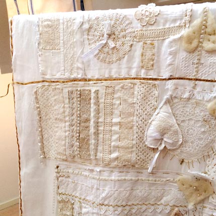 O visst är det vackert, mycket arbete har det varit att ta till vara och planerat hur och var ska alla dessa små detaljer sys in, ( små spetsar, pärlor, broderade hjärtan) och mycket mera, flera år har detta arbetet varat. Helt sagolik är denna skapelse och den kommer väl till pass en dag. Pst! Finns endast i ett exemplar men så vackert bårtäcke.