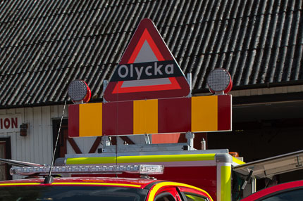 På taket finns en varningsskylt ”Olycka” som enkelt fälls upp vid till exempel trafikolyckor.