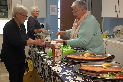 Ansvariga för köket och från Tre Hammare, dukade fram en härlig vårlunch. Avnjuter tillsammans den mycket goda maten. Varmrökt lax med tillbehör.
