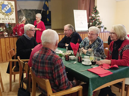 Kerstin Göransson ordförande, var spindeln i nätet, såg efter så allt fungerade. Medlemmarna hade tagit plats och samtalen kommit igång runt borden. När allt ansågs vara klart, var kl.13.30 Tog Kerstin mikrofonen i sin hand och -”Hälsade alla medlemmar välkomna till årets julfest. Julmaten var nu framdukad, var så goda och börja”.