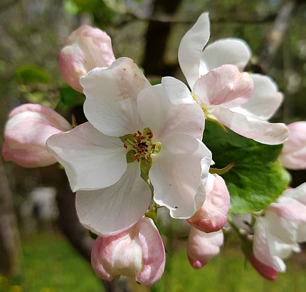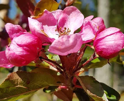 Äppelträdens blomning blev otroligt vacker. Vi har ett äppelträd med röda blommor och bladen går även åt det röda hållet till. Vilken sort detta är vet vi inte, för det är självsått. Troligen har en fågel tappat ett frö och det tar sig för varje år. Äpplet har både rött skal och kött. Kanske någon av er läsare som vet vad det är vi har.