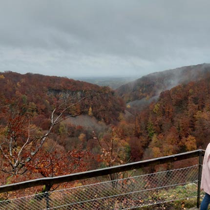 Kopparhatten, denna vackra plats där man kan se över hela dalen och milsvida sträckning vid klart väder. Det finns bilväg hitupp och något som tillkommit sedan vi var här förra gången var en ramp för rullstolar, så även de som behöver en sådan kan komma fram och blicka ut över dalen. Vandringen fortsatte på åsen med ännu några vackra utsiktsplatser som vi besökte, innan vi var framme vid den långa trappan som leder ner till platsen som vi utgick från. Tre yngre tonårsgrabbar som var precis efter oss sa att det var 199 steg på denna trappa, skall kolla nästa gång vi kommer hit.