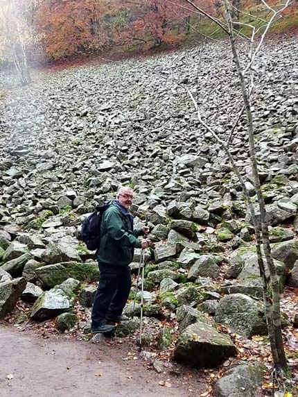Vi gick längs med en porlande bäck på en plankförsedd gångstig nere i dalen, informationsskyltar fanns med jämna mellanrum, så även några bänkar om man behövde sätta sig och vila en stund. På vissa ställen var sluttningen helt stenklädd endast lite mossa växte på några av stenarna.