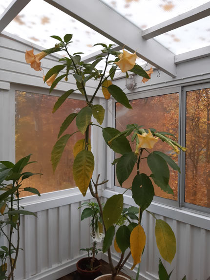 Första bilden visar en dubbelblommande änglatrumpet, denna vita blomma är lite annorlunda än de andra vita, rosa eller gul orange. Nämligen att den här vita änglatrumpet är dubbel i sitt utseende som blomma men också att den blommar nedåt hängande hela tiden, men doften är sagolik. Många knoppar väntar på sin tur att få blomma, hinner kanske.
