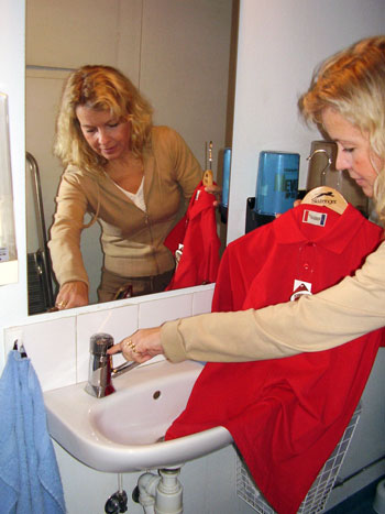 Hon öppnar kranen och spolar kraftigt mot tröjan, stänger kranen och skakar tröjan lätt.