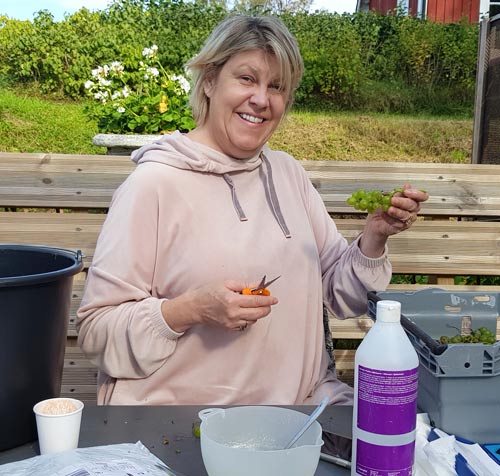 Det första vi ser när vi är på plats är att det skördas för fullt bland de 500 plantor av den gröna druvan Solaris, som växer på vänster sida på slänten ner mot Vieån. Ett 25 tal personer har kommit för att delta i detta denna ljuvliga höstdag.