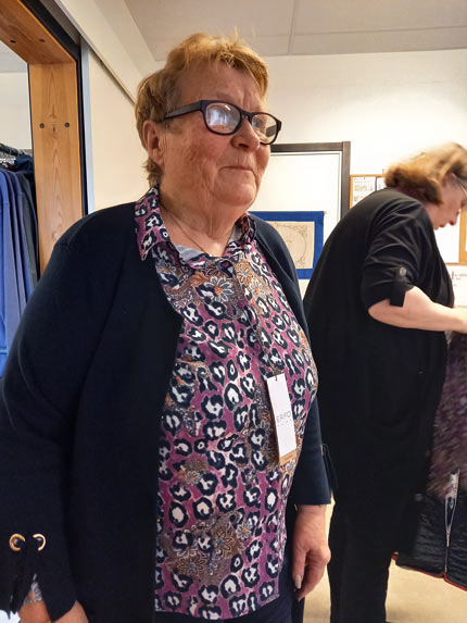 Gunilla visar här en top som är i svagt lila på mörk nyanserade bottenfärg i blått, under en mysig långkofta med guldfärgat spänne på ärmarna. Härliga färgkombinationer tillsammans med mogna modeller, som skapar en vardags flärd som kan räcka långt. Det finns mycket snyggt för den manliga köparen, tyvärr fanns ingen manlig modell i år, men det kommer kanske nästa gång. Men kläder fanns det gott om även underkläder/nattkläder, halsdukar, mjuka hattar i glada färger men också i utförandet. Kul att så många hade hörsammat denna torsdagsträff på "träffpunkt linden" Bra service för alla dom som inte kan ta sig till stan.