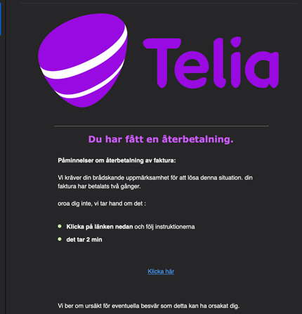 Detta bluffmail är lite svårare att avslöja. Innehåller en extrabokstav i länken (ett c framför ordet telia).