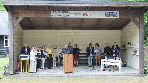 Firandet på Bjärnums Museum hamnar i den något mindre kategorien. Trots att regnet hängde i luften, samlades publiken framför scenen för att ta del av underhållningen av Alegriakören och höra talet från Eva Skantze.