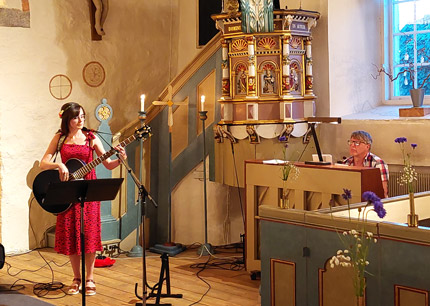 VITTSJÖ. Denna midsommarafton var vädret när svensk sommar är som bäst, 24 grader, sol och svag vind. Efter traditionellt firande av midsommarafton så var beslutet att besöka midsommar gudstjänsten i Vittsjö vackra lilla kyrka. Marie Bengtsson hälsade församlingen välkomna till musik i sommarnatten.